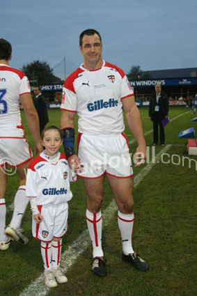 ![]() Adrian Morley with the England mascot. Ref: Gillette 01 |