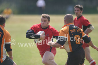 ![]() Andrew 'Kiwi' Bradshaw takes on the defence. Ref: Dem_Tig 03 |